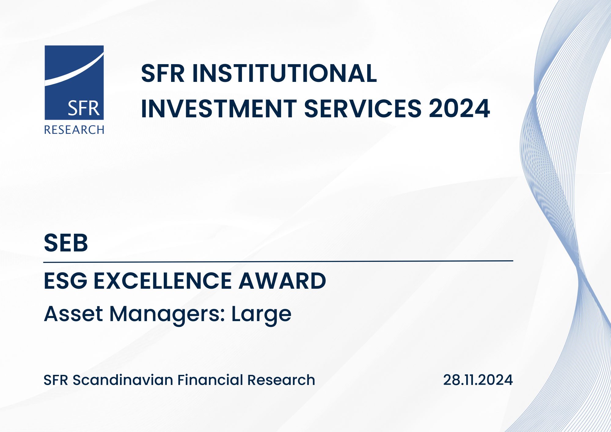 SFR:s ”Institutional Investment Services” undersökning har utförts regelbundet sedan år 2000 i form av djupintervjuer med cirka 100 av Finlands mest framstående institutionella investerare. Undersökningen belönar de mest framgångsrika kapitalförvaltarna inom olika kategorier. SEB rankades som etta bland de stora kapitalförvaltarna inom området ansvarsfulla investeringar.